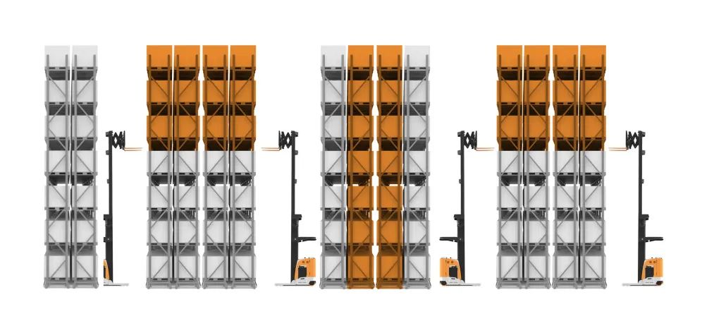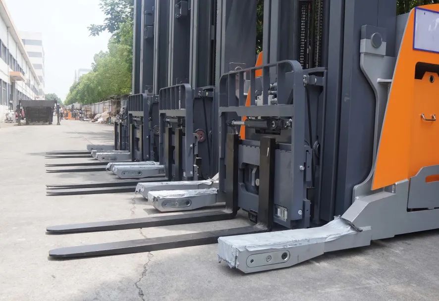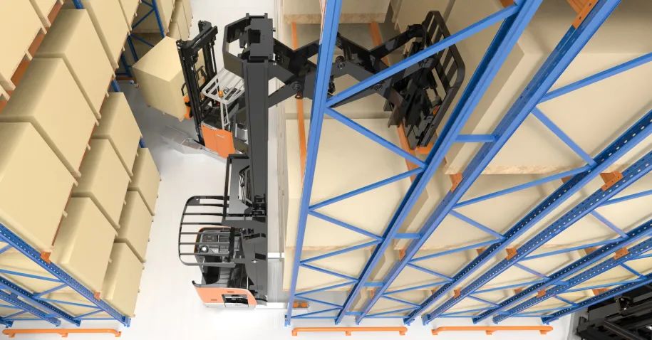 能够在单侧对两排并列货架上的货物进行纵深存取,只需一条3.1m的通道即可操纵四排货架的货物。相较其他窄巷道叉车,平均巷道宽度更窄、仓储单元更多。