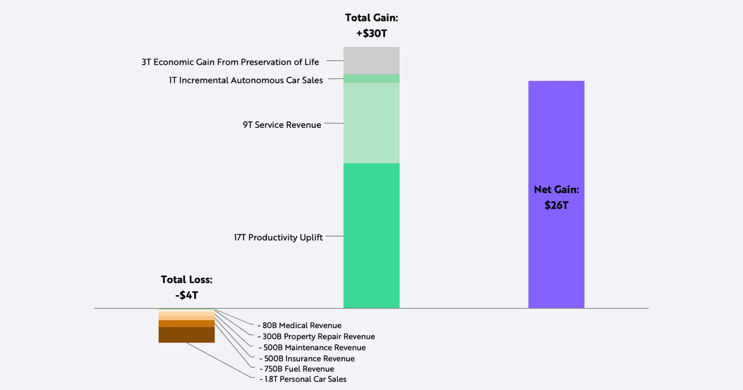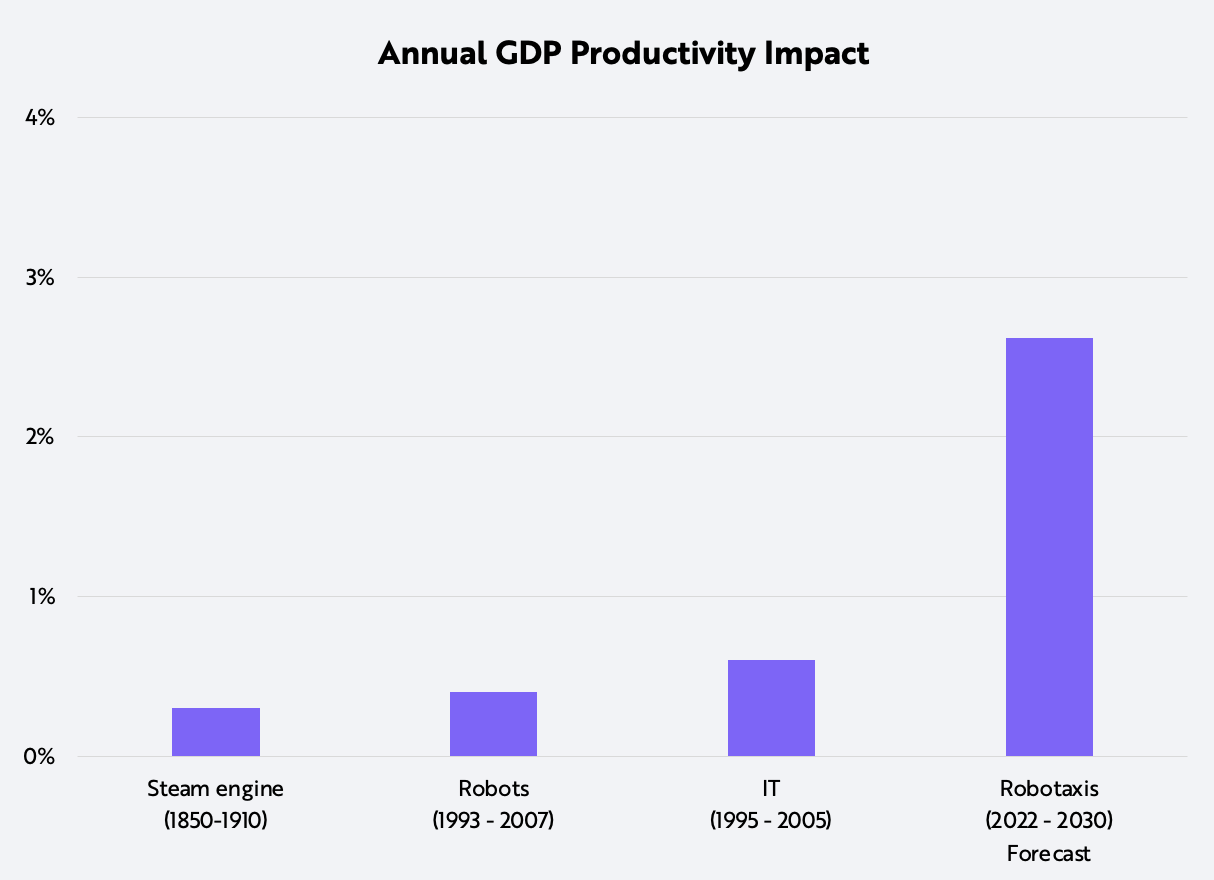 据 ARK Invest 称,到 2030 年,自动驾驶出租车带来的收入以及出行时间缩短带来的生产率提高将为全球 GDP 每年增加 30 万亿美元。另一方面,由于交通事故减少、汽油车销量下降以及燃料和维护成本降低,自动驾驶汽车的引入每年可能使 GDP 减少 4 万亿美元。最终结果似乎是自动驾驶汽车每年为全球 GDP 增加 26 万亿美元。这相当于到 2030 年全球 GDP 每年增长 2-3%。