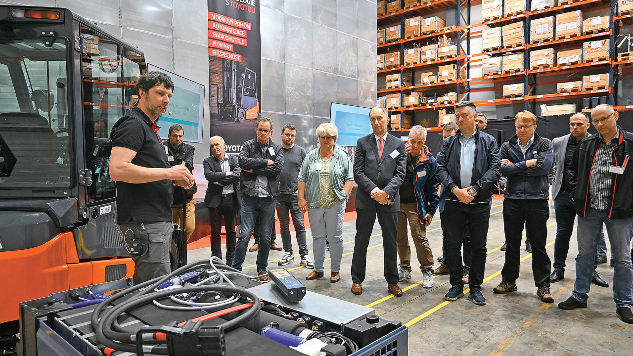 丰田物料搬运公司(简称丰田MH)的专家 Aleš Selix(最左)描述了氢燃料电池叉车在仓库实践中的优势以及氢电池的工作原理(前景)。在 Aleš Selix 后面,是配备 1.8 公斤氢燃料电池的丰田Traigo型叉车。