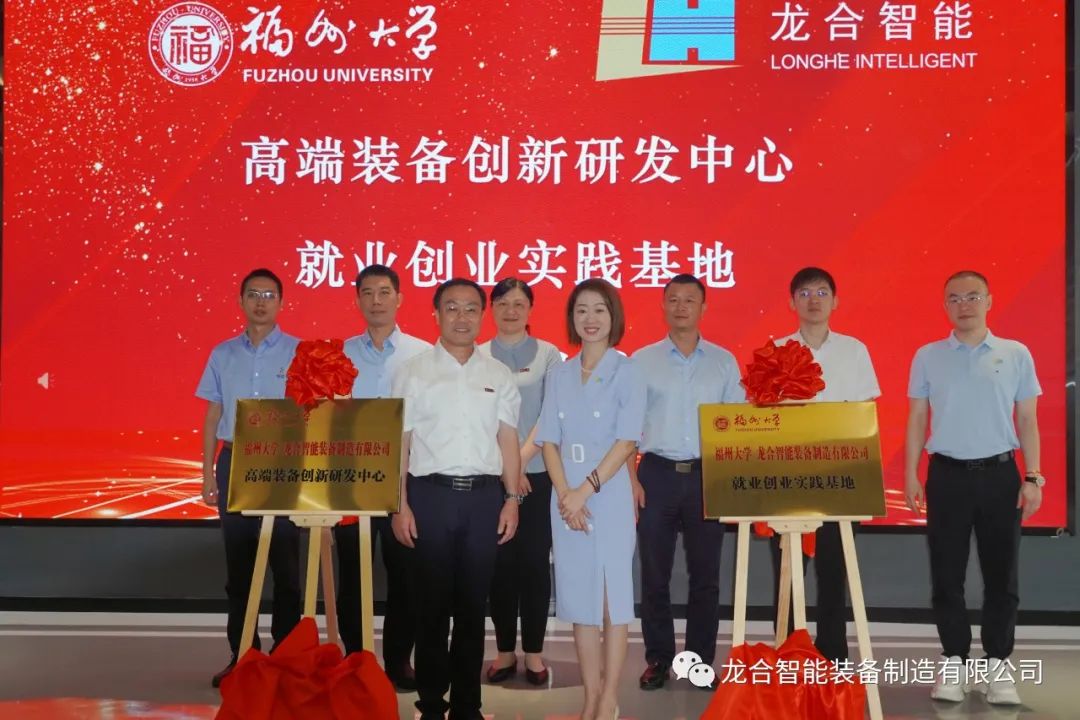 福州大学副校长林键、龙合智能董事长杨静在参会人员的共同见证下为“高端装备创新研发中心、就业创业实践基地”揭牌,随后,双方基于人工智能、学科研究、校企合作、实习实践、人才培养等方面展开研讨,共同探讨产教融合发展新模式。