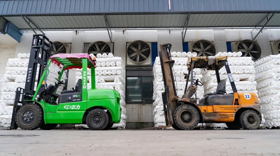 一边机器轰隆巨大噪音不绝于耳,浓黑尾气喷涌而出;一边崭新绿色叉车静谧作业,偶尔听见门架升高货物堆放的声音。这一强烈对比画面在安吉某龙头纺织企业内生动呈现。