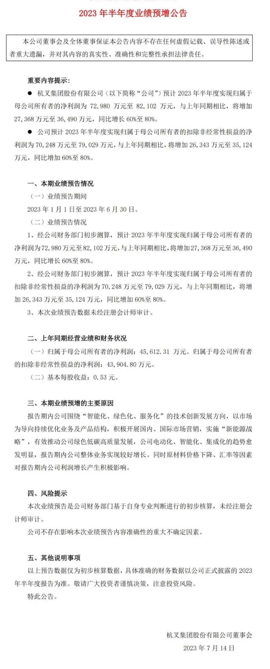 杭叉集团股份有限公司 2023 年半年度业绩预增公告