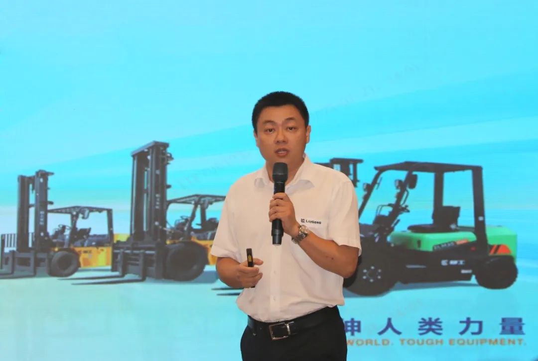柳州柳工叉车有限公司党总支书记、总经理黎汉驰作《上半年国内营销工作总结及下半年重点工作报告》,在报告中,他详尽地阐述了工业车辆在过去数年中的产品销售额、产品分类、市场分布以及在中国各省份的市场占有率。他特别强调上半年国内市场表现不佳,竞争愈演愈烈,价格也在持续下滑。各大生产商纷纷寻求国际化的发展,以此应对充满挑战和压力的外部环境。为了确保公司能持续实现经营目标的增长,需要柳工叉车的全体员工和所有经销商一同努力,携手并进。他表示面对国内市场的不确定性,为了实现持续的增长突破,公司决定启动一项自上而下的全新改革计划。我们会坚决贯彻公司的重点工作部署,以应对市场压力,并朝着实现高质量发展目标努力。