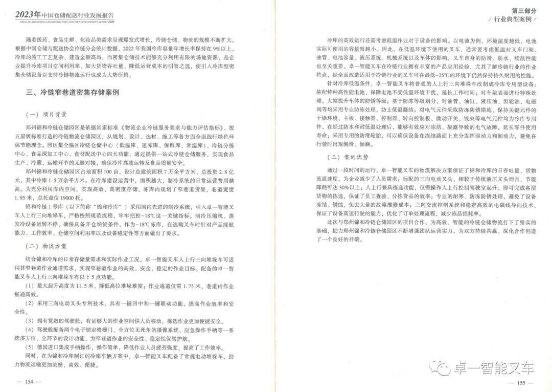 卓一智能叉车报送的《卓一智能叉车:VNA窄巷道叉车赋能郑州锦和冷链物流密集存储》,作为行业典型案例之一,成功入编。