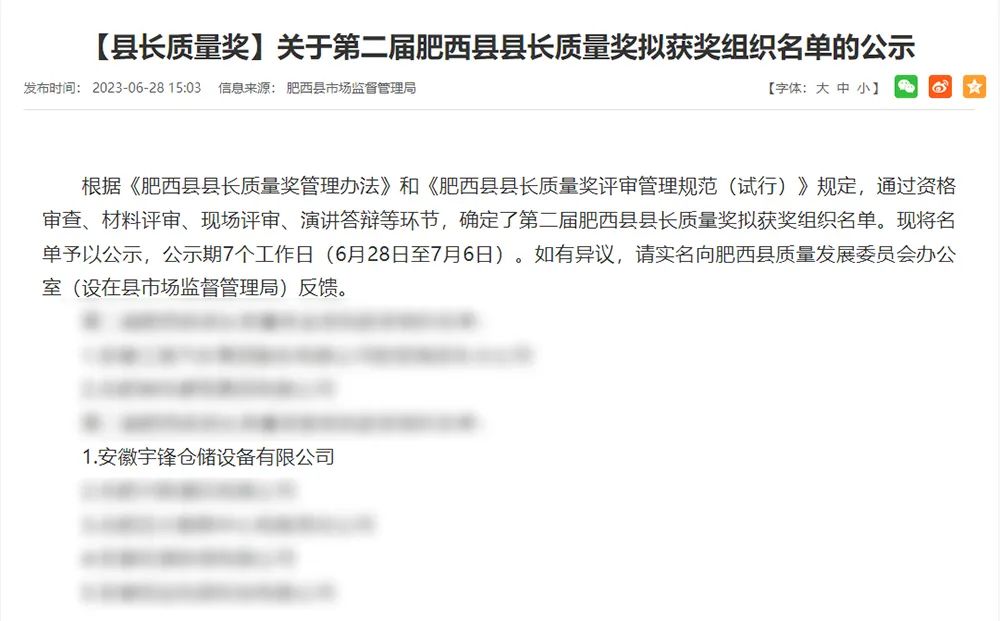 近日 ,肥西县市场监督管理局下发关于第二届肥西县县长质量奖拟获奖组织名单,安徽宇锋荣获第二届“肥西县县长质量奖”。