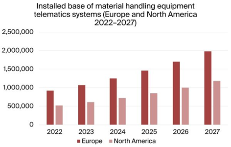 物料搬运设备远程信息处理市场正在快速增长。根据Berg Insight的研究,欧洲和北美是该领域远程信息处理系统的先进市场。预计到2022年,欧洲主动式物料搬运设备远程信息处理系统的装机量将超过90万台,到2027年,装机量将达到200万台。北美地区的增长也非常迅速,预计到2022年,装机量将超过50万套,到2027年,装机量将达到120万套。