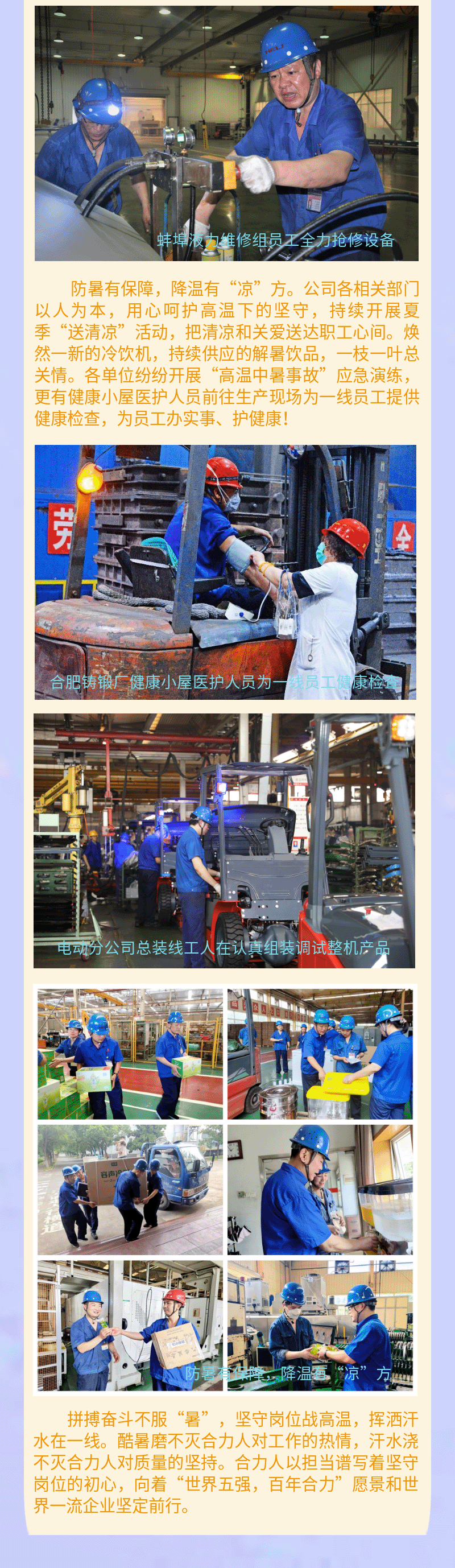 合力自诞生至今承载着许多人的希望。合力愿景是企业使命的必然要求,是领导对合力的殷切期望,是产业报国的社会责任,是对客户、员工、股东、供应商、社会公众多年来对我们支持的回应,是超越自己跻身世界一流的激励。争取早日进入世界叉车行业五强,将合力品牌打造成国际一流,从而实现百年合力,基业长青。