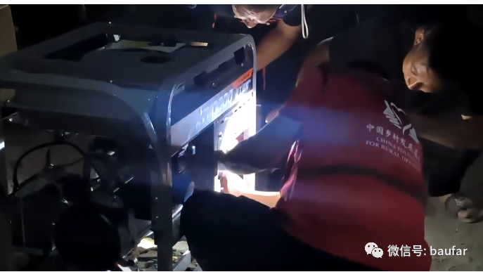 安徽省防灾减灾救灾协会第一时间出发至河北涿州救援现场参与救援行动,在救灾抢险工作中,便携式电源的实用性和易操作性提升了整体应急救援质量。8月6日晚上安徽省防灾减灾救灾协会王会长协助中国乡村发展基金会点亮灾区项目-发电机安装工作,进山区时山区没电、没水,只能依靠随身携带的照明及应急电源设备提供现场照明以及手机的充电,解决了与外部稳定的通讯断电问题后,救援队员们趁夜间指导安装使用发电机。宝发公司的便携式电源夜间照明大放光彩,那一缕灯光照亮夜间的同时温暖了救援队员们的内心。