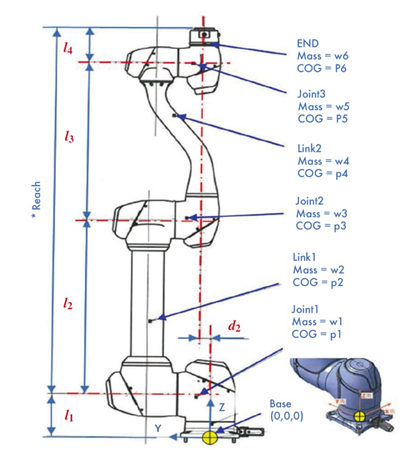 这些参数(图 1)通常由协作机器人制造商提供,还包括关节和连杆质量以及相对于基面坐标的重心位置的详细信息。
