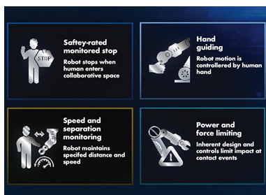 在选择任何协作机器人时,安全性至关重要。由于协作机器人在共享空间中与人类协作,因此它们必须配备许多固有的安全功能。彻底的风险评估对于确定特定的协作机器人设计是否满足预期的安全需求至关重要。典型的安全功能包括基于集成到设计中的传感器来防止过大的力、扭矩或速度的限制。安全运动配置由安全风险评估的结果决定,该评估定义了与特定安全事件相关的停止模式。