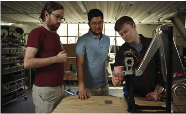 美国麻省理工学院的研究人员(左起):Elijah Stanger-Jones、Hongmin Kim 和 Andrew SaLoutos 设计了一种机器人抓手,它结合了反射功能,可以快速抓取和分类日常物品。