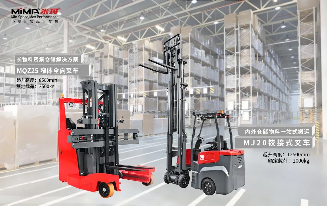 1、 MiMA 铰接式叉车和窄体座驾式全向叉车的使用,使仓库通道减少,货架高度提高,增加了仓库可用面积,提高库容率。