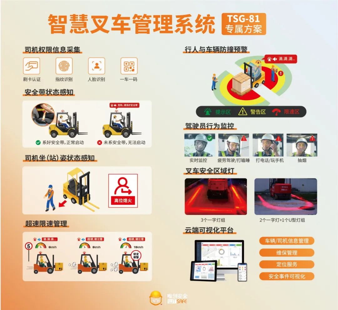 TSG 81叉车安全新规就是要通过司机权限信息采集器管住那些无证操作的行为!这与市监局对在用叉车推行的驾驶人员身份识别,叉车作业人员指纹识别功能或者人脸识别功能是一致的。唯创安全作为一家深耕市场20多年的叉车安全与管理解决方案提供商,在2021年,我们就已经开始为江苏各地的叉车技改项目服务。唯创安全SF-110智慧叉车管理系统,要求司机通过人脸/刷卡/指纹等认证方可启动叉车,具备离位熄火、安全带感知、超速限速、司机不安全行为识别警示等功能。截至目前,叉车技改采购装机量已超过1.5万台。