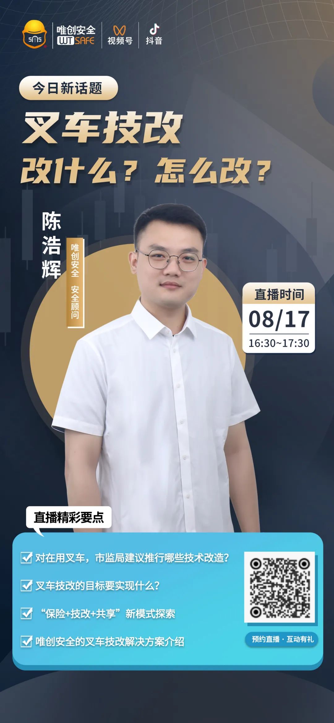 本周四下午4点半,唯创安全直播间准时开播,由金牌安全顾问-陈浩辉为我们带来分享:叉车技改,改什么?怎么改?快来预约直播啦!