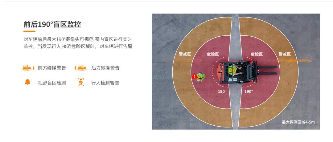 防撞管理:当人员靠近车辆时,AI系统做出精准识别,并发出预警提醒,辅助司机消除驾驶盲区。