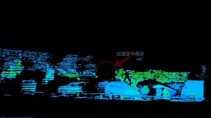 图3-4在下雨时,密集雨水的散点,会被当作障碍物,阻碍车辆或机器人的运动路线 ,在雷达去除雨水散点,可减轻上位机的数据处理负担。由此可见,CH128X1感知更精准,灵敏度更高。