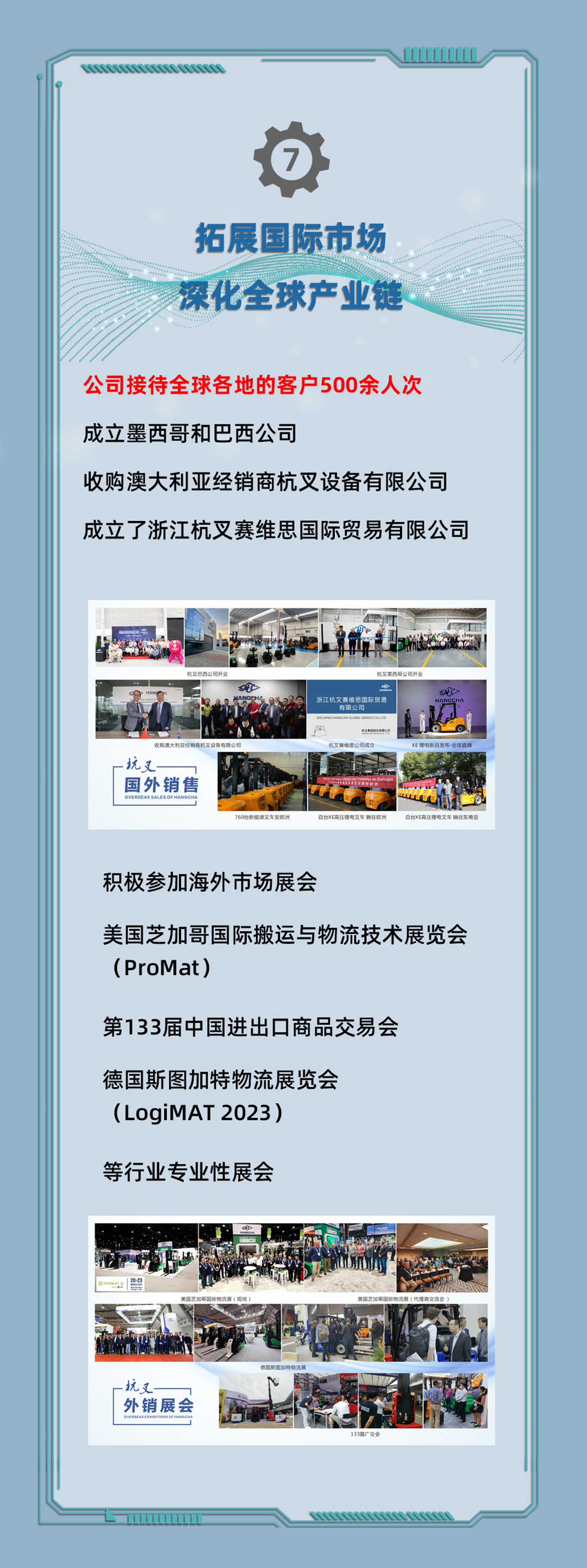 杭叉集团产品销量十多年持续位列行业前茅,连续十年保持行业出口第一。据美国《MMH现代物料搬运杂志》对全球叉车按销售额排名,杭叉集团位列世界第8位。杭叉集团的销量已占世界机动工业车辆总销量的7%以上。
