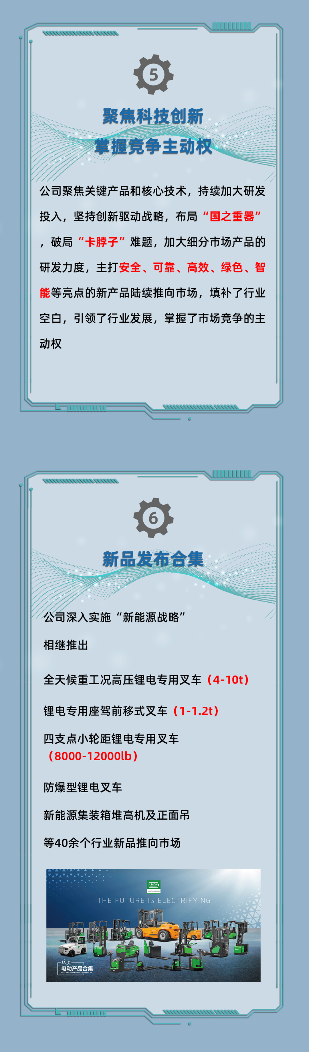 公司已形成1-48吨内燃叉车、0.75-18吨蓄电池叉车、集装箱专用叉车、45吨集装箱正面吊、牵引车、搬运车、堆高车、越野叉车、伸缩臂叉车、登高车等全系列、多品种的产品结构以及多款AGV智能工业车辆,达上万种品种规格。自主开发的新产品多次荣获全国机械工业大奖,省、市科技进步奖,并获全国用户满意产品称号,主导产品获国家出口免验资格。