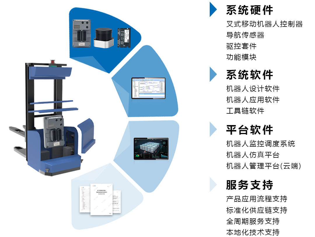 叉式移动机器人在行业初期,各机构、企业所使用的控制系统大多来自海外,随着国家提出加强创新投入,规避产业链核心技术“卡脖子”风险,以及智能物流系统逐渐成熟和市场化需求的改变,物流设备智能控制管理系统的国产化成为行业共同关注的重点。目前叉式移动机器人的一些关键零部件,如电机、驱动器、传感器和控制器仍然非常依赖国外进口,急需高品质的国产化方案。