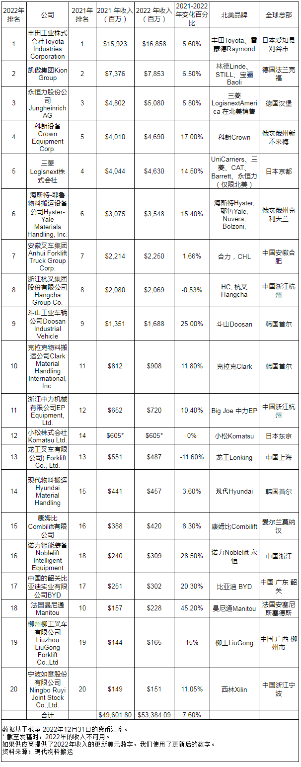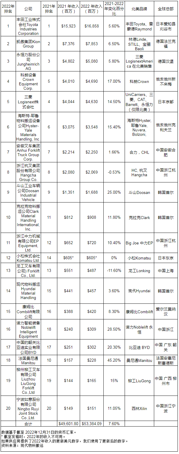 2022年全球20强叉车供应商排行榜(MMH排名)(基于2022年收入)