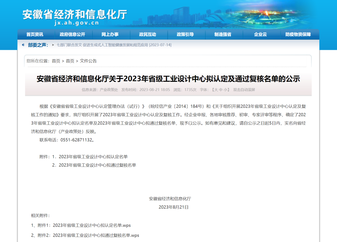 8月21日,安徽省经济和信息化厅公示了2023年省级工业设计中心拟认定及通过复核名单,经过层层筛选,安徽优旦科技有限公司工业设计中心获“2023年省级工业设计中心”认定。