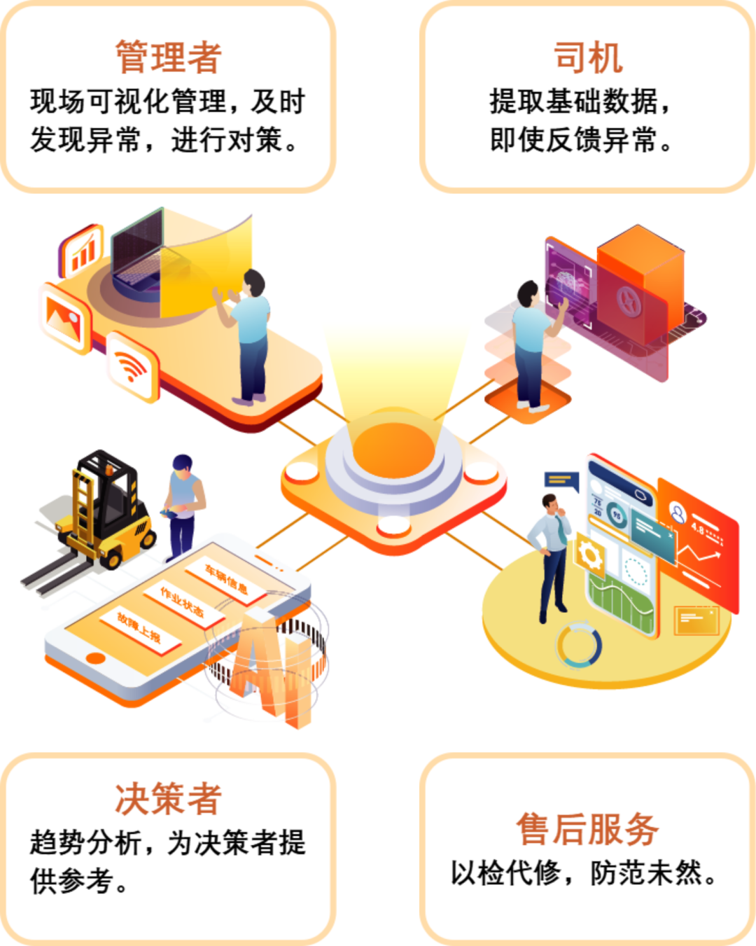 结合丰田精益物流理念,丰田车队管理系统可在建立标准的基础上,通过现场数据的收集和分析,助力打造可视化现场。帮助现场管理者把握现状,及时发现异常,解决问题,评估并建立新的标准,帮助企业实现基于现场的持续改善。