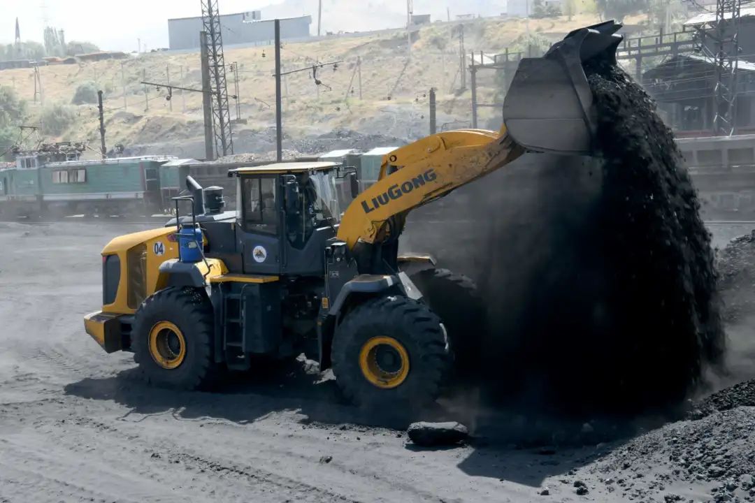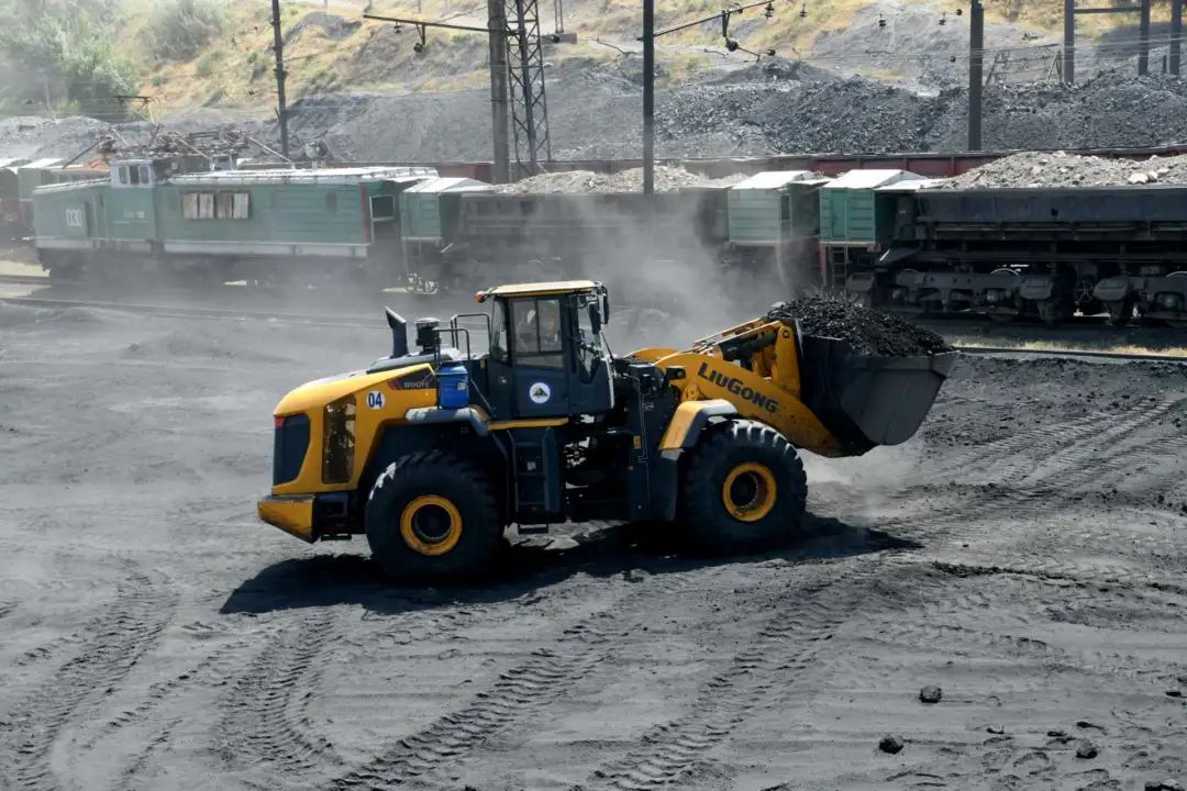 在塔什干某煤矿开采现场,只见柳工890H装载机正在给火车皮里装上煤渣,煤灰漫天飞舞,柳工设备依然强劲有力。
