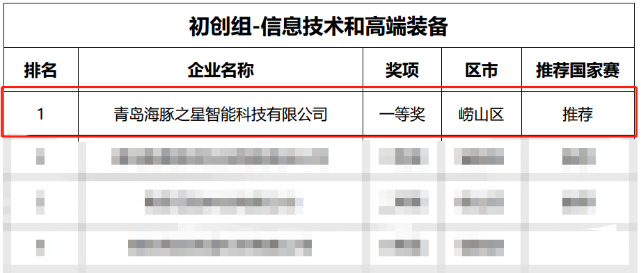 公开公示的名单中,青岛海豚之星智能科技有限公司荣获崂山区初创组-信息技术和高端装备一等奖。