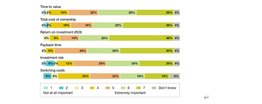 当被问及他们在决定采用机器人技术时考虑的最重要的业务因素时,70% 的人表示实现投资回报率非常或极其重要,而 64% 的人认为投资回收时间非常或极其重要。其次是总拥有成本 (60%)、价值实现时间 (56%)、投资风险 (50%) 和转换解决方案的成本 (36%)。