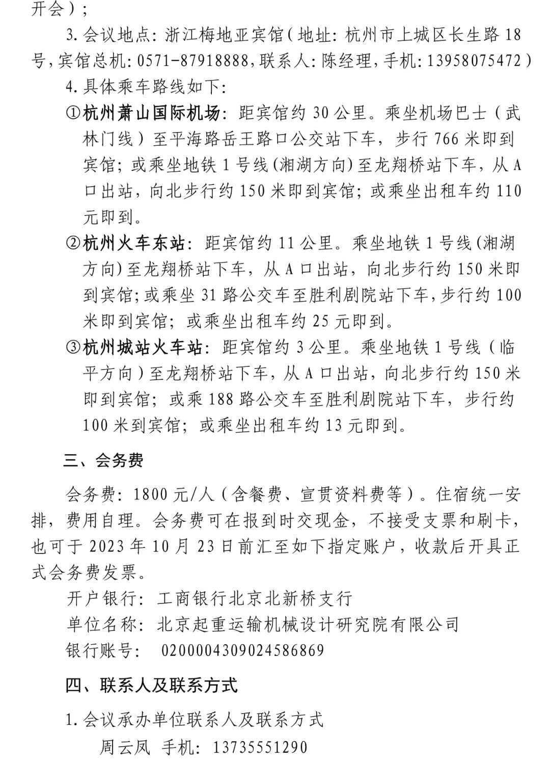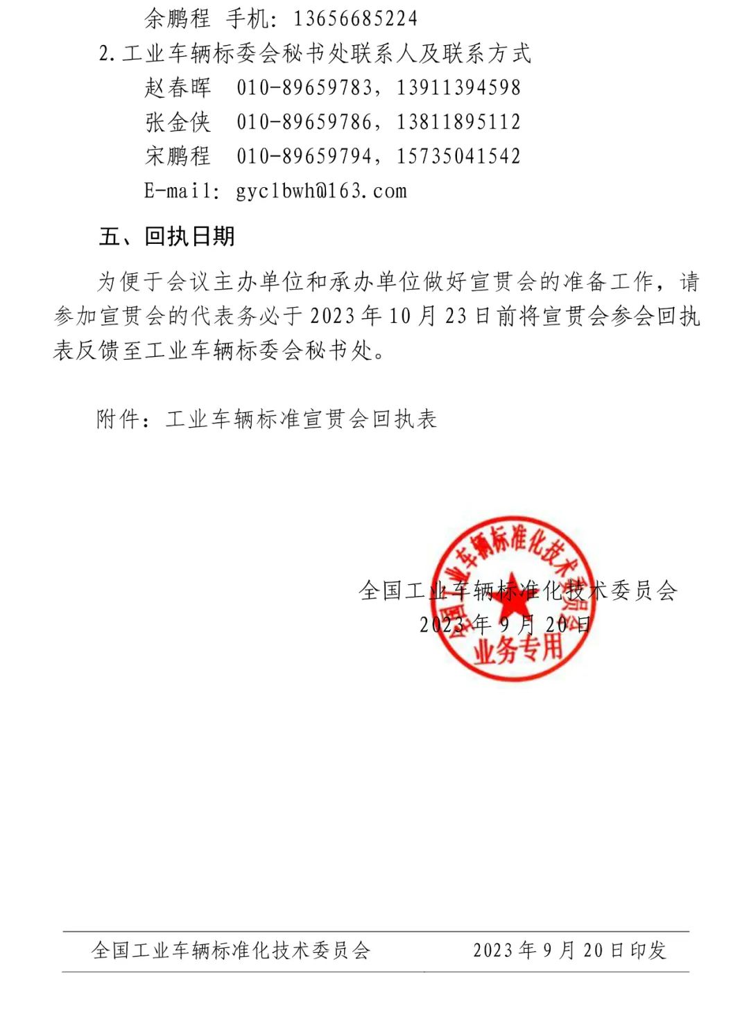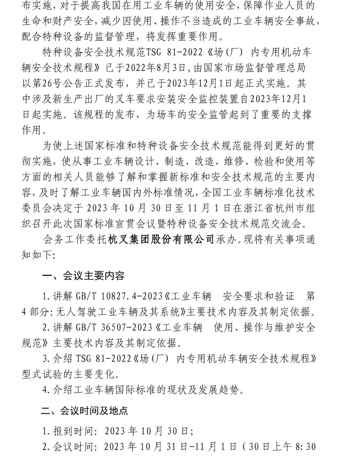 为使上述国家标准和特种设备安全技术规范能得到更好的贯彻实施,使从事工业车辆设计、制造、改造、维修、检验和使用等方面的相关人员能够了解和掌握新标准和安全技术规范的主要内容,及时了解工业车辆国内外标准情况,全国工业车辆标准化技术委员会定于2023年10月30日至11月1日在浙江省杭州市组织召开此次国家标准宣贯会议暨特种设备安全技术规范交流会。会议通知及相关事项如下: