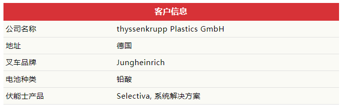 伏能士 Selectiva 客户案例Thyssenkrupp Plastics 有限公司位于德国埃森市,是一家塑料供应商,在德国共有18家工厂。该公司于2022年4月开设了新的物流中心,...