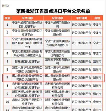 喜 报 近日,浙江省商务厅公布第四批浙江省进口贸易促进创新示范区和重点进口平台名单,诺力智能装备股份有限公司进口供应链平台获授浙江省重点进口平台。 浙江省重点进口平台是浙江省打造成“世界超市”的重大举措,希望通过政策扶持,推动平台创新,延伸供应链,给全省进口工作起到示范引领作用,平台认定程序包括推荐申报、现场考察、专家评审、公示、认定、授牌等程序。 诺力智能装备股份有限公司成立于2000年,在全球布局有诺力北美、诺力欧洲、 诺力俄罗斯、诺力控股新加坡等19家子公司,8大工厂,2个境外研发机构,主要业务包括智慧物流系统业务和智能制造装备两大板块。 诺力是贸易型龙头企业,为满足产业升级和市场升级需求,诺力优化进口结构,针对欧洲发达国家的驱动轮、减速箱、泵站等先进技术设备进口,形成多样化的物料搬运设备配置组合,具有较大的进口规模。
