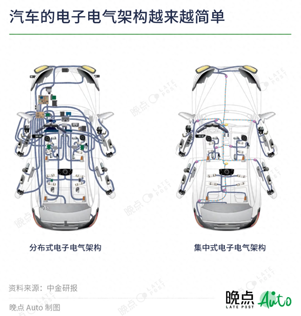Model 3 对汽车供应链带来的另一个变化是,电子电气架构集中化,ECU 的数量更少、线束更短。一辆传统汽车上,开灯、空调等功能都需单独的 ECU 来控制,同时需要用线束来连接这些 ECU。Model 3 之前的汽车,一般有约 80 个 ECU,线束可长达数公里。如 2019 年上市的大众新高尔夫有 70 个 ECU,背后是超过两百个供应商;奥迪 A8 的线束长度超过 6 公里。