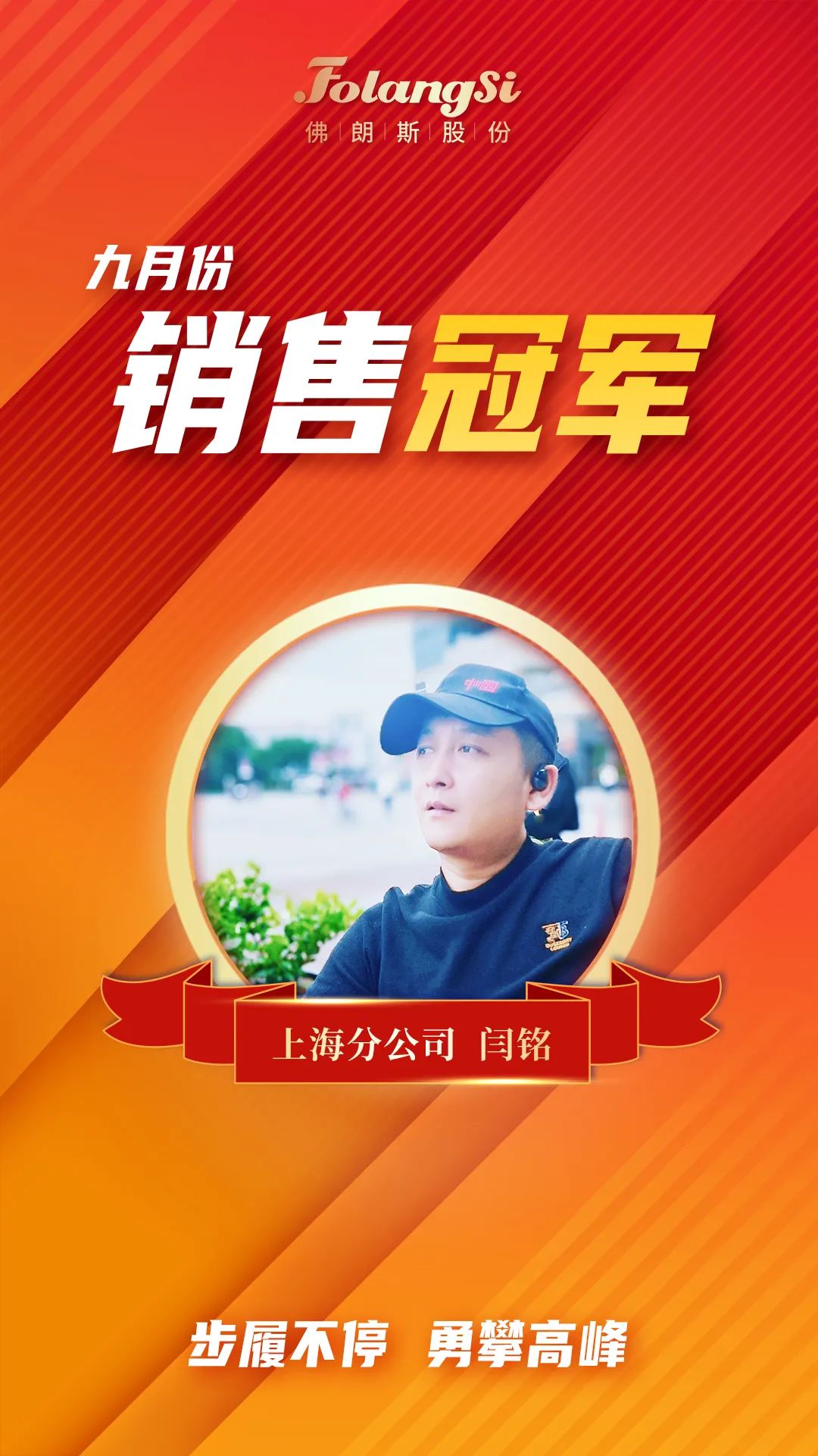 闫铭作为佛朗斯股份国内事业版块的上海分公司的一员,一直以来都发挥着举足轻重的作用。他以饱满的工作热情,精湛的业务能力和卓越的才能,在销售的道路上不断前行。9月份的销售冠军荣誉,正是对他不懈努力的肯定和表彰。