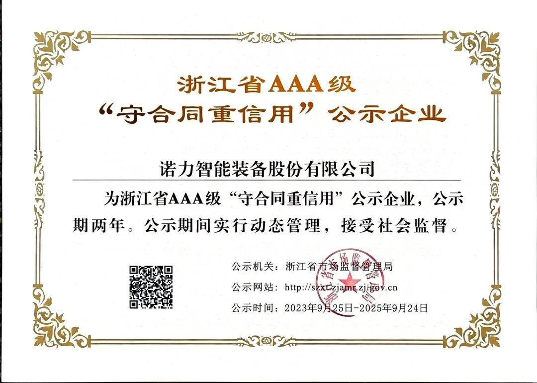 据悉,浙江省“守合同重信用”企业公示,每年开展一次,公示期二年,浙江省“守合同重信用”企业是诚信履约、守法经营、效益良好的“示范领跑”企业,AAA级,更是诚信经营领域最具权威性和含金量的称号。