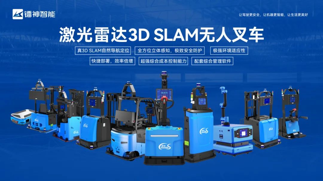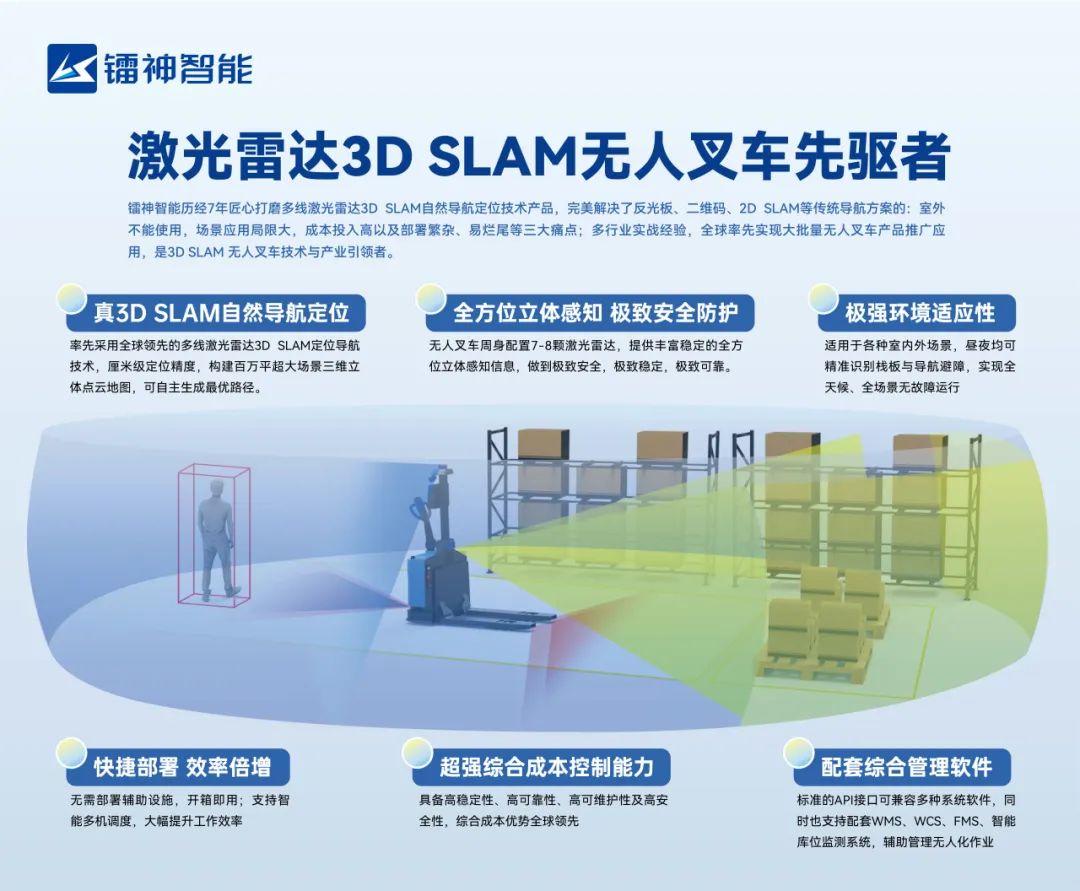 镭神智能作为全球领先的全场景激光雷达及整体解决方案提供商,在2017年开始研发激光雷达3D SLAM定位导航技术,并应用于无人叉车,成为行业内3D SLAM无人叉车技术应用最早、技术最先进、技术最成熟、作业最安全、落地应用项目最多的公司。镭神智能激光雷达3D SLAM无人叉车完美解决了传统无人叉车反光板、二维码、2D SLAM方案的场外不能使用、场景应用局限大,成本投入高以及部署繁杂、易烂尾等三大痛点,具备3D立体防护、全方位的3D环境感知、适用于各种室内外场景、综合成本控制能力强、配套综合管理软件齐全、部署便捷无需辅助等优势,可应用于工厂自动化、仓储自动化、港口自动化等应用场景。