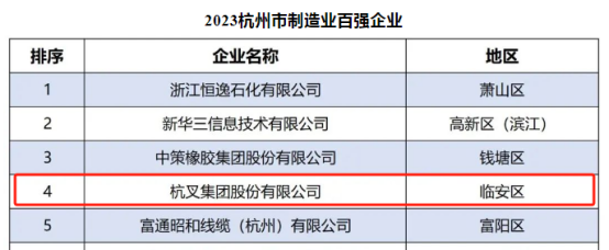 浙江省工业和信息化研究院、杭州市工业经济联合会、杭州市企业联合会、杭州市企业家协会发布《2023杭州市制造业百强企业》等榜单。杭叉集团荣登《2023杭州市制造业百强企业》前5强。