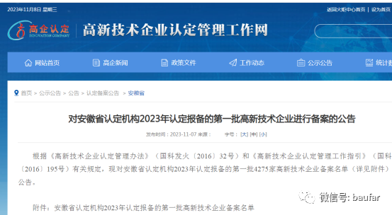 近日,安徽省认定机构2023年认定报备的第一批高新技术企业进行备案的公告进行了发布。合肥宝发凭借雄厚的技术和研发实力成功入选,第四次入选国家高新技术企业行列。