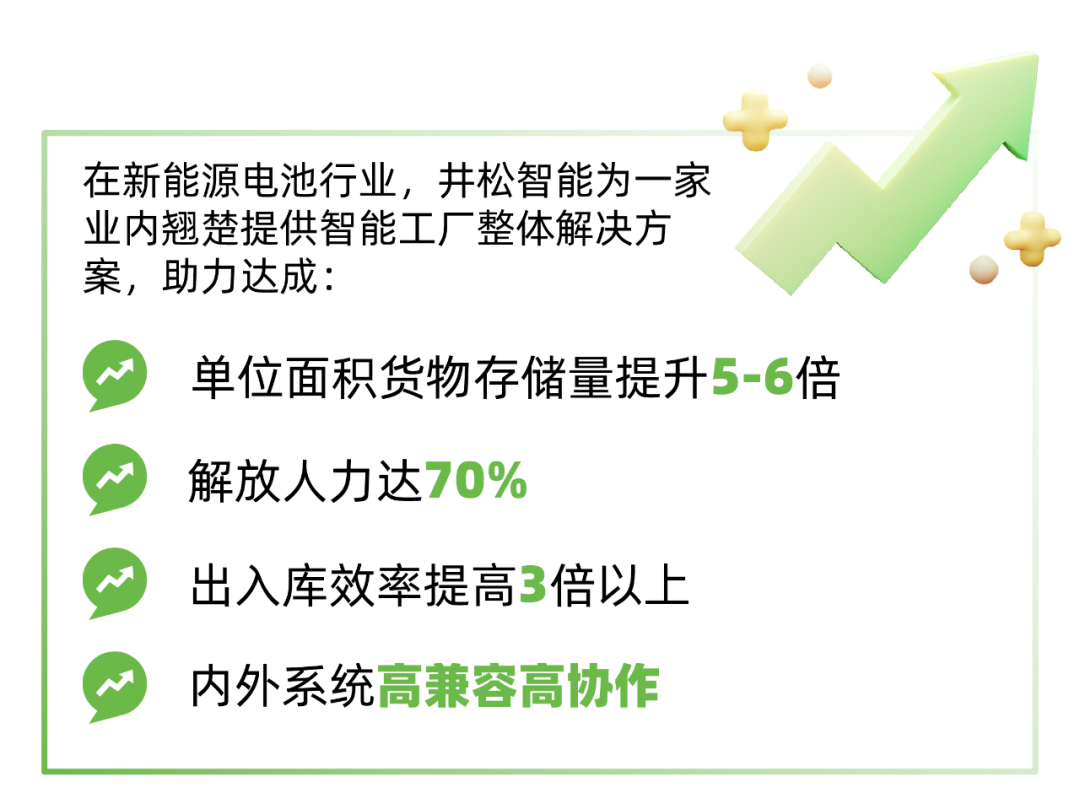 面对新能源行业,井松智能运用符合行业标准的产品与方案设计,采用业内前沿智能物流管理系统,大幅提升设备运行效率与准确性,加强内外系统间智能化、柔性化联结,助力新能源行业步入智造升级更高阶段。