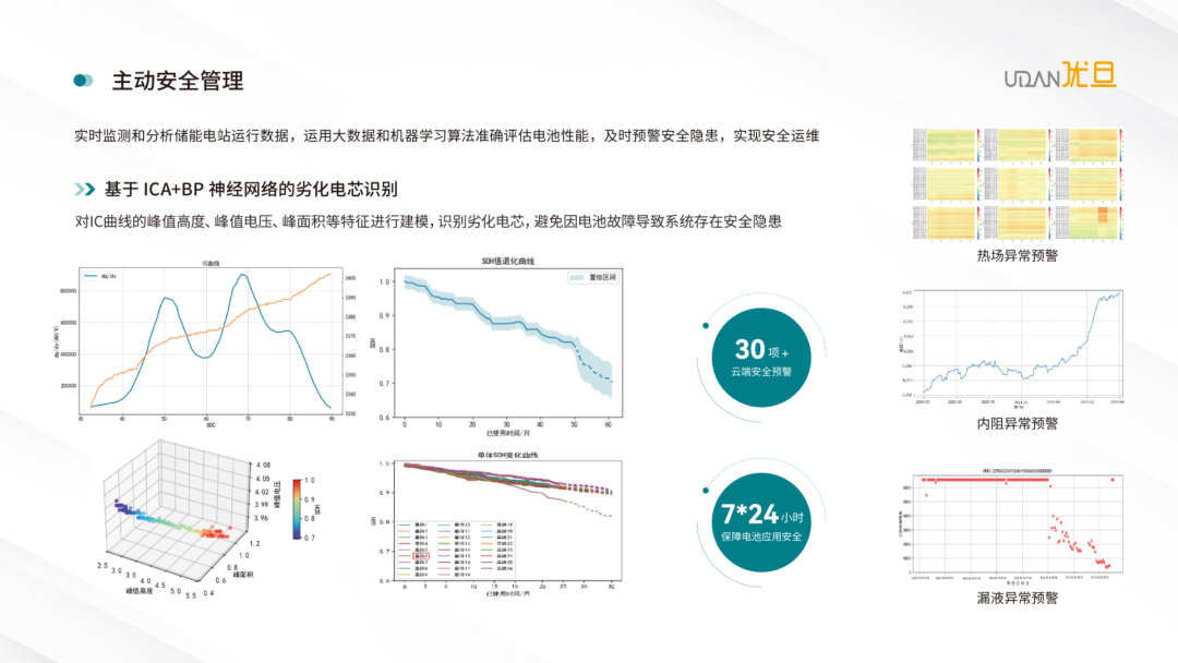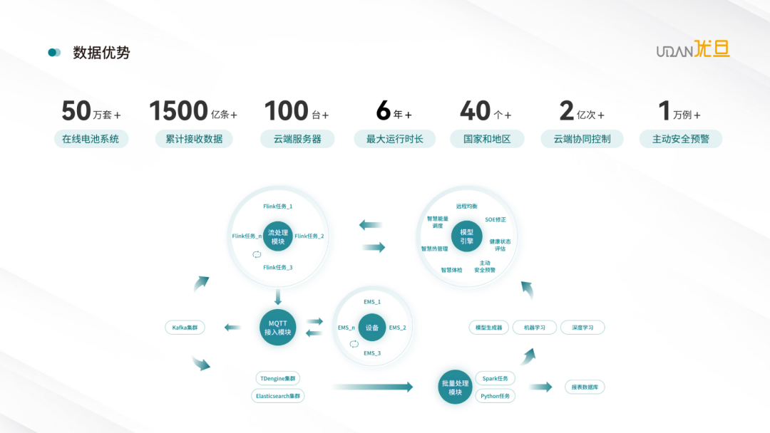 优旦在数据这一块有非常好的积累,经过六年多的发展,我们的数据平台已经在线50多万台电池系统,全球累计接收的电池数据超过1500亿条,我们在云端部署了超过100台服务器,最长的电池系统运行时长已经超过六年,接近全生命周期。
