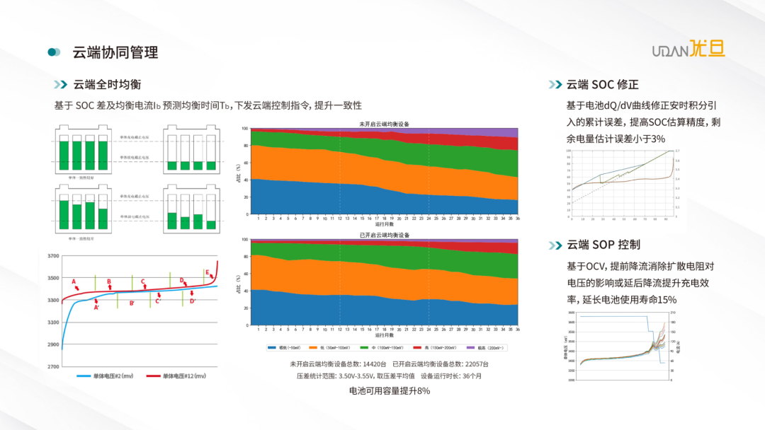 电池的一致性和均衡管理是锂电池管理最核心的功能之一,关系到单次充放电可用容量,将直接影响储能系统的收益。传统的基于压差的均衡判断,很难识别出真正需要均衡的电芯,我们的云端全时均衡技术基于每颗电芯的历史充放电数据,可以精准地计算出每颗电芯的SOC值,进而清晰地识别出需要均衡的电芯,并通过SOC差异预测均衡时间,然后将均衡时间切分成每十秒一个指令,推送到终端去执行。我们通过后台的数据统计,电池累计可用容量提升8%,在工商业储能相对单一的工况下,提升效果将更加明显。另外,我们的SOC云端修正、SOP云端功率辅助控制等技术都已经实现了产品化。