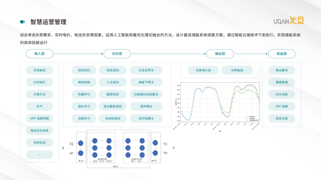 在智慧运营方面,工商业储能的收益包括峰谷套利、需量管理、风光消纳、VPP调峰、现货交易等多种模式,每个模式又对应不同的离散型输入侧参数变量,如何通过多维度的变量回归得出最优的储能系统充放电规划、功率规划,这中间需要复杂的算法,我们也做了深入的研究积累。