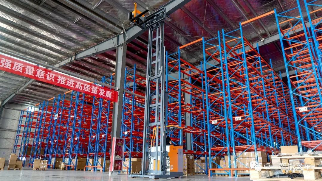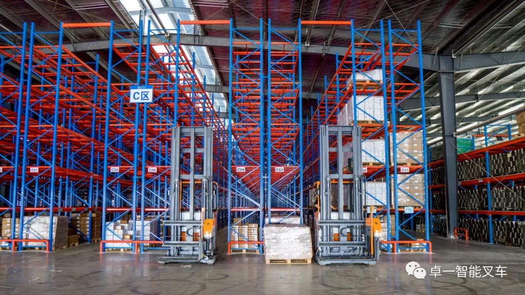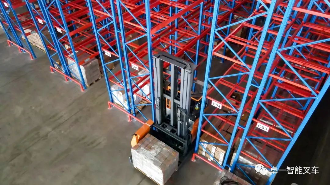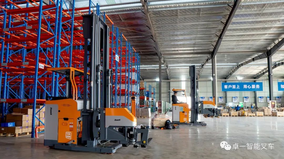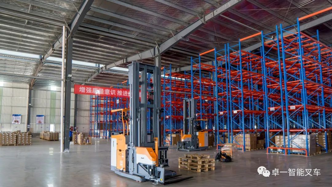 在进行多方考察后,该企业最终选择了卓一智能叉车提供的窄巷道方案,卓一以最大载重1600kg,最大起升高度9500mm的人下行三向叉车为企业高密仓储、高效堆垛需求助力。