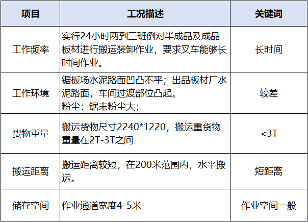 该板材生产基地,主要是仓库内外的原料板及成品板材的搬运堆垛,对叉车的稳定性和承载力有着极高要求。叉车需要在不同的地面条件下,进行长时间的高效作业。此外,对于室内作业还需要特别关注叉车的排放问题,以维护车间空气质量。