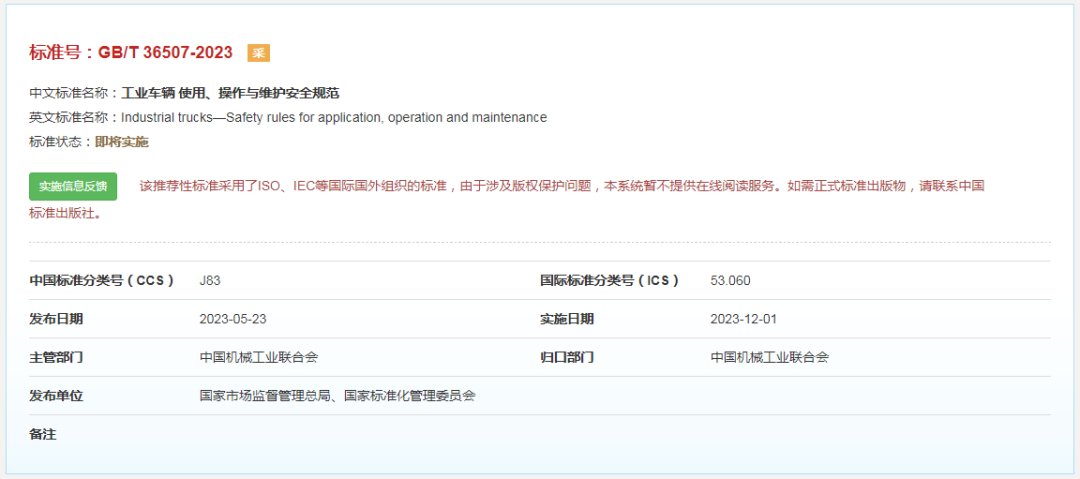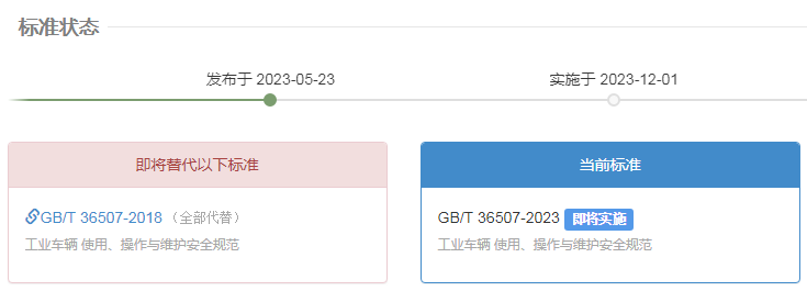 GB/T 36507-2023《工业车辆 使用、操作与维护安全规范》已于2023年5月23日正式批准发布,将于2023年12月1日正式实施。该标准规定了工业车辆在使用、操作、维护、运输、牵引、组装、存放和改装时的安全要求。