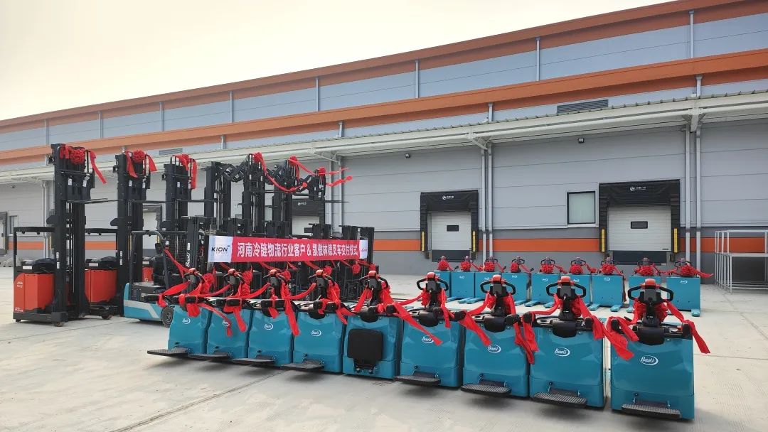 近日,在国家发改委发布的新一批25个国家骨干冷链物流基地之一——河南漯河物流基地,举行了一场亮眼的交车仪式。凯傲宝骊向一仓储物流龙头企业集中交付了8台三支点电动平衡重叉车和24台站驾式电动托盘搬运车,助力其冷链运输业务做大做强。
