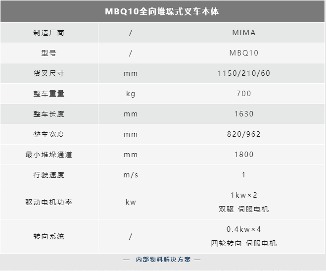 MiMA米玛最新研发推出的MBQ系列全向堆垛AGV本体,采用轻量化车身设计兼备全向行驶功能,使其能在狭窄通道、密集型托盘货架间自由行进,并胜任大型仓储楼层作业,转运优势明显,极大地提升仓储运输效率、降低成本。
