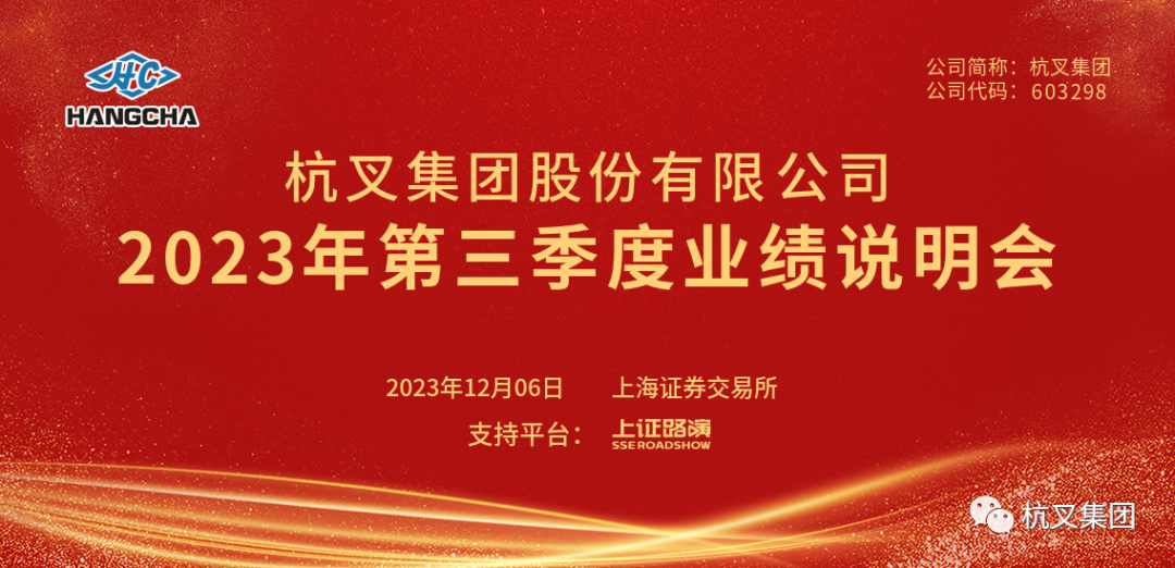 2023年12月6日,杭叉集团股份有限公司(股票代码603298)通过上证路演网“业绩说明会互动平台”成功举办线上“杭叉集团2023年第三季度业绩说明会”,与广大投资者就公司发展战略、业绩表现、未来规划、海外拓展等议题进行了坦诚充分的交流。出席本次业绩说明会的嘉宾包括公司董事长兼总经理赵礼敏先生、独立董事蔡云峰先生、总经理助理兼董事会秘书陈赛民先生以及总会计师兼财务负责人章淑通先生等。