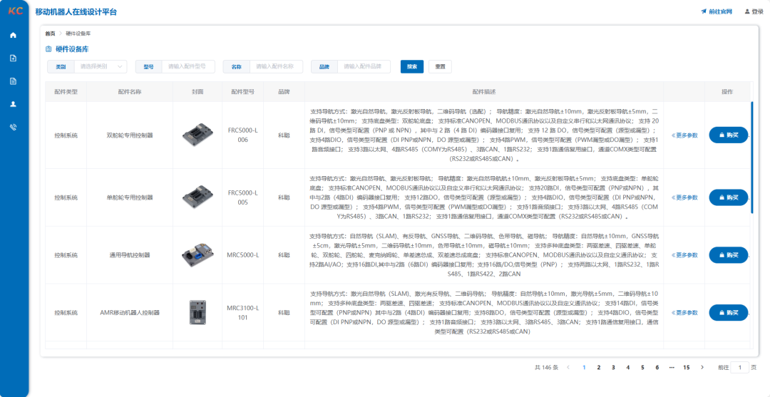硬件设备库提供了包括移动机器人所需的控制器、驱动器、传感器、安全模块、执行机构等多类移动机器人组件,通过科聪控制系统端多年的持续适配和精心筛选,我们收录了国内外优质的上游硬件设备,并提供其详细的品牌型号和产品资料,您可以根据现场需求进行查询、购买……