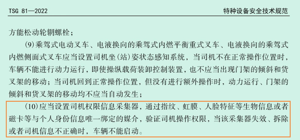 这与TSG 81-2022《场(厂)内专用机动车辆安全技术规程》的要求是一致的。工业车辆应当设置司机权限信息采集器,通过指纹、虹膜、人脸特征等生物信息或者磁卡等与个人身份信息唯一绑定的媒介,验证司机操作权限,当该采集器失效、拆除或者司机信息不正确时,车辆不能启动。